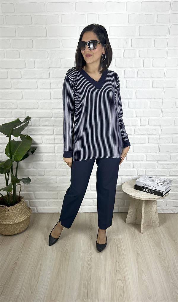 Kadın uzun kollu çizgili baskılı büyük beden lacivert beyaz penye bluz-bgb138 - Charamela